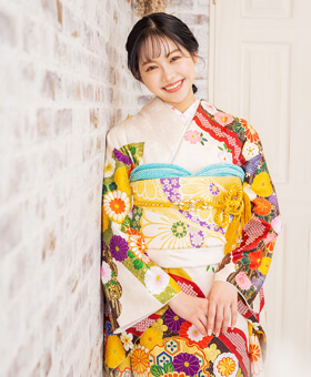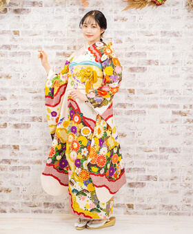 クリーム地の振袖には松や笹、菊、桜、花鏡が描かれています。