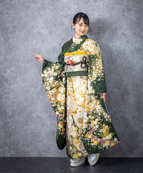 中性色として知られる緑色は、成人式の場でも甘すぎずシック過ぎず、どちらの魅力も兼ね備えた雰囲気に。