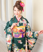 丁寧に染め上げた深緑の地色がシックな印象を与える振袖。