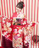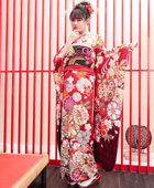 人気の高い赤地にワインレッドの配色が印象的な振袖。