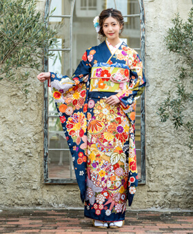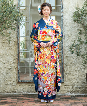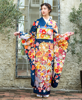 成人式の振袖レンタルで大人っぽく艶やかな雰囲気になる紺地の振袖。