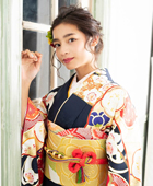 紺地に大胆な流水がアクセントの振袖。振袖に描かれる梅の花には、厳しい冬を超えて美しく花を咲かすことから「忍耐力」や高貴なイメージとして、