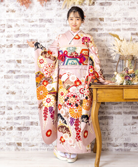 彩度を押さえた上品なピンク地の振袖[FS5003]には菊や松、桜や流水が描かれています。