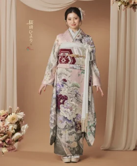 桜田ひよりさんがモデルを務める振袖「淡ピンク地うす紫牡丹に四季花[FR5032]」は、優雅さと華やかさを兼ね備えた一着です。