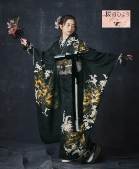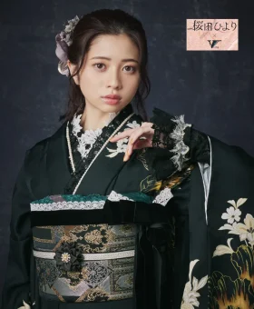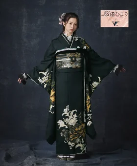 女優・桜田ひよりさんがモデルを務める振袖「黒地牡丹に白華[FR5033]」は、伝統美と現代的なエレガンスを融合させた一着です。