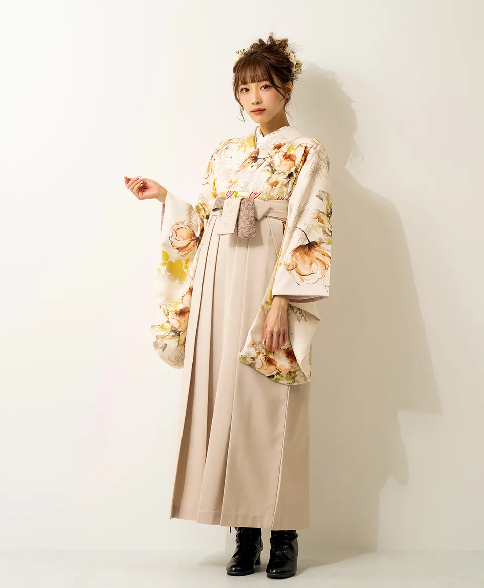 同系色のくすんだスモーキーベージュの袴を合わせ、色味を抑えた控えめなコーディネートに。