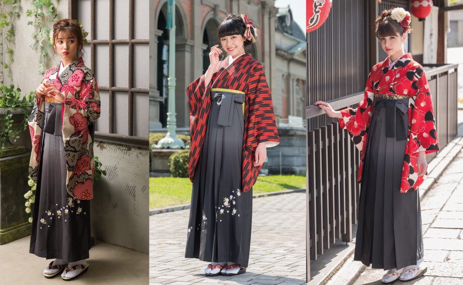 (一番右) 着物:黒×赤椿/袴:コン紐格子サクラ刺繍