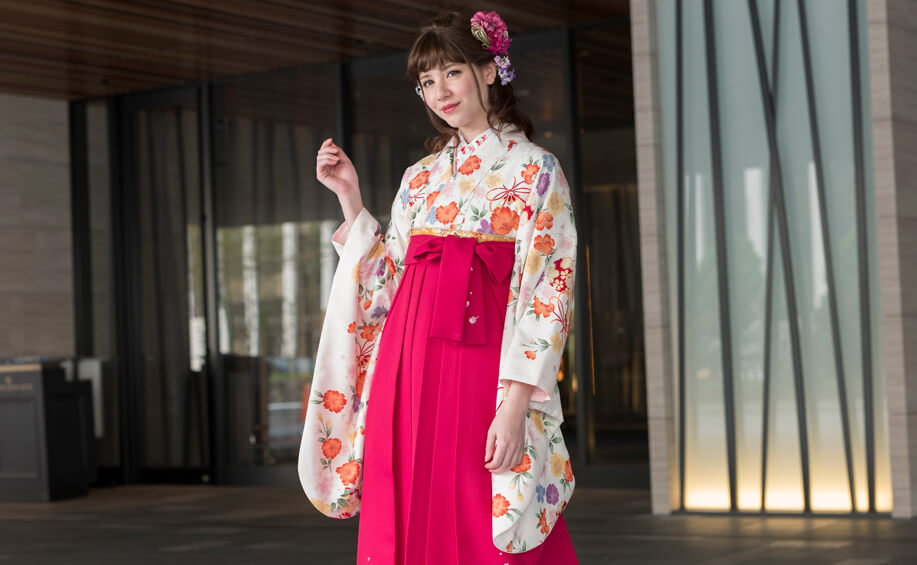 どんな袴の色にも合わせられる白のお着物ですから、どう見られたいかを考えて袴を選ぶといいでしょう。