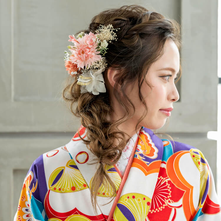 フォーマルなスタイルでも、カジュアルなスタイルでも万能なヘアアレンジがサイド編みおろしスタイルの特徴です。着物全体が豪華な分、ヘアスタイルをシンプルにまとめると、コーディネートが洗礼されて見えます。