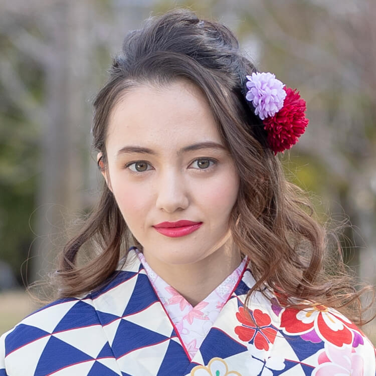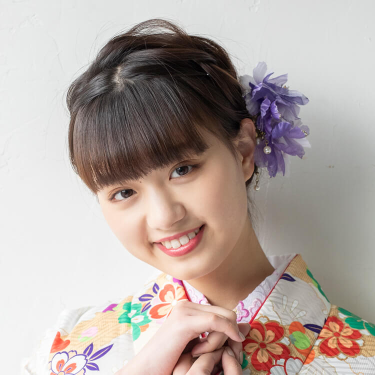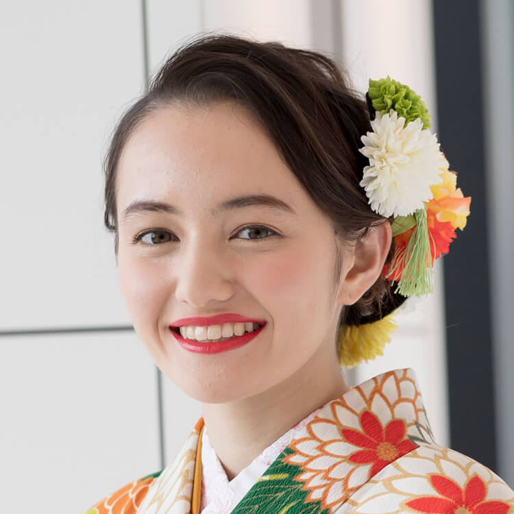 POPでカラフルな菊柄には、シンプルなシニヨンヘアで可愛らしく