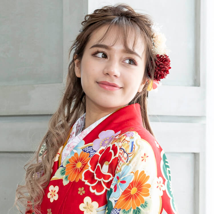 今年人気のレトロモダンには、落ち着いた雰囲気にピッタリのハーフアップとの相性抜群。着用しているのは「赤に雲絞りに花鏡」のお着物です。