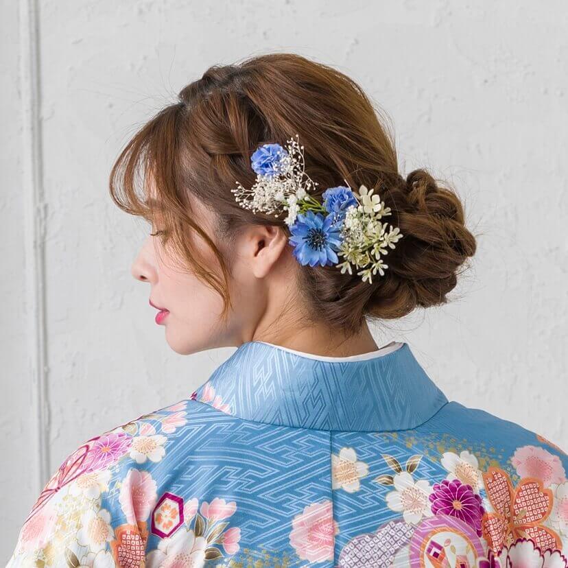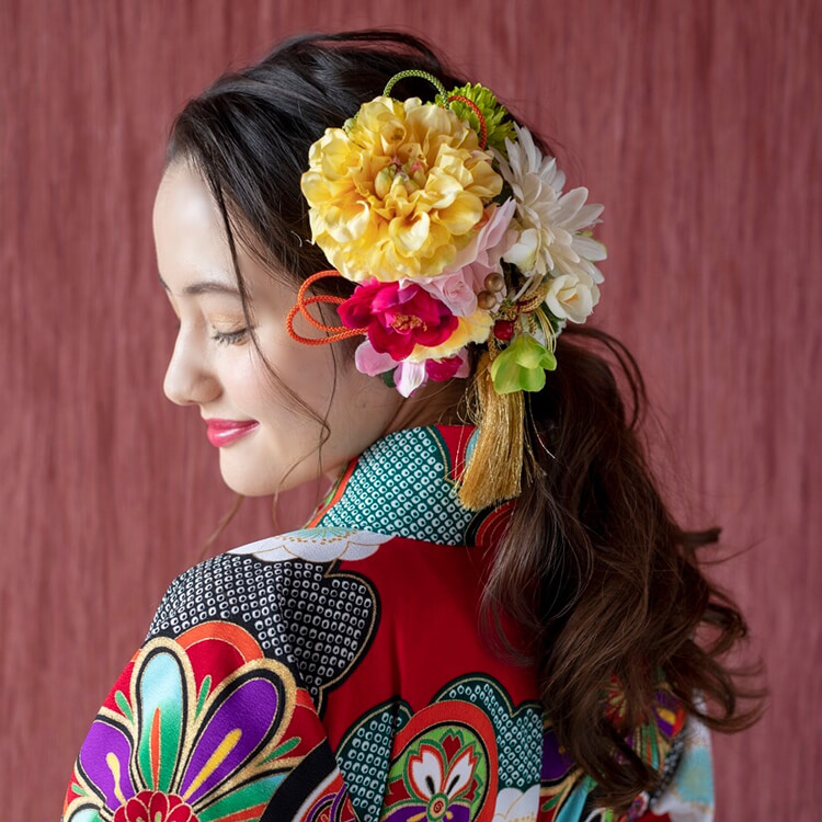 シックなデザインの着物には華やかな髪飾りを添えて、バランスを整えるとより品のある印象に。