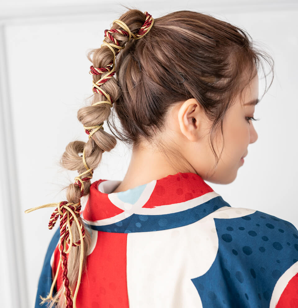高めのポニーテールに2種類の紐を使用したヘアスタイルです。