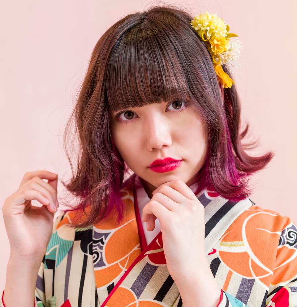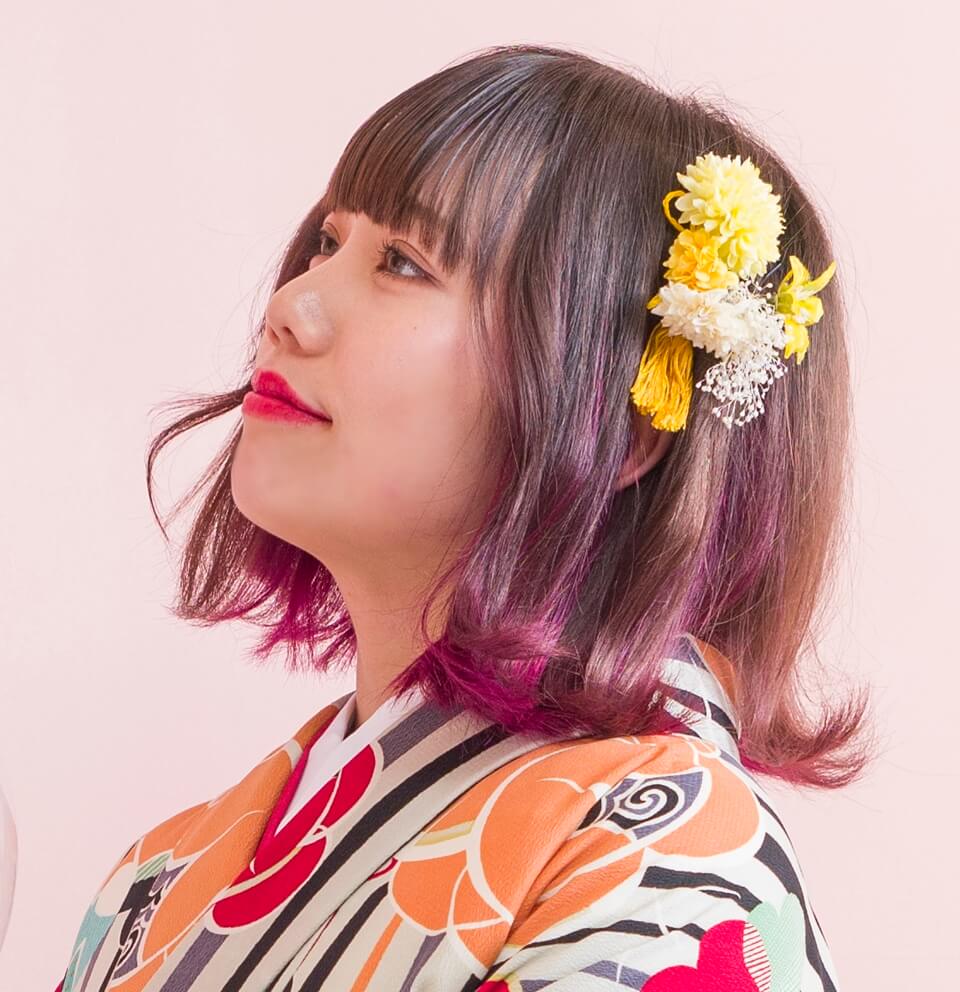 ポップデザインの袴にぴったりの外ハネ×ボブスタイル。