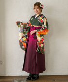 卒業式で古典柄をオシャレに着こなすなら着物:フカミドリ友禅四季花[DDD865]と、袴:ワインボカシ[WNB030]のコーディネートがおすすめ。