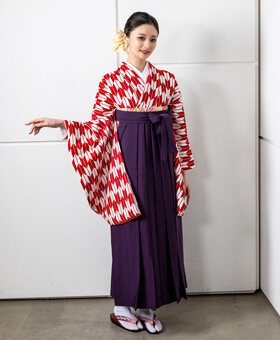 赤と白の矢絣柄(やがすりがら)の着物に紫の袴を合わせてみました。