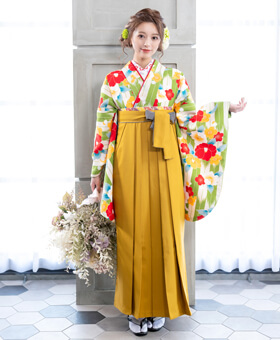 黄緑の矢絣の上に、椿の花弁や葉をぼかし染めで描いた華やかなデザインのお衣裳です。