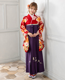 卒業式を祝う、華やかな鶴が描かれた赤い着物に上品な紫色の袴を合わせています。