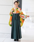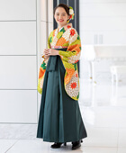 鮮やかな黄緑色が目を引く着物[BBB454]に、緑色の袴[FMI005]の組み合わせ。