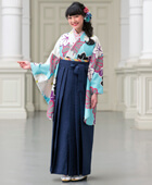 水色地に菊紅葉柄の着物[CCC574]。紺色の袴[KSK092]の組み合わせ。