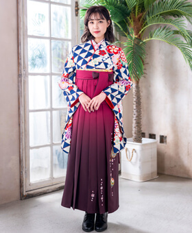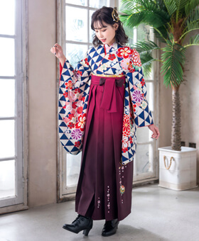 青色のウロコ模様のお着物に女性らしいエレガントなワインボカシの袴を合わせています。