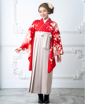 卒業式の袴レンタルで赤地の着物「赤ラメ桜」にトレンドのくすみカラーの袴「スモーキーピンク」を合わせたコーディネートです。