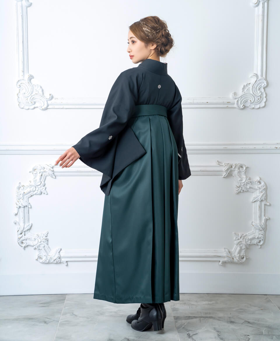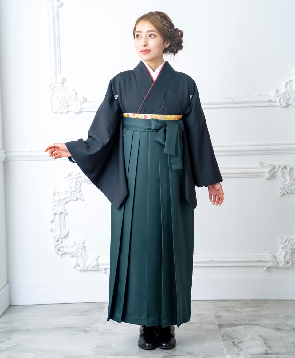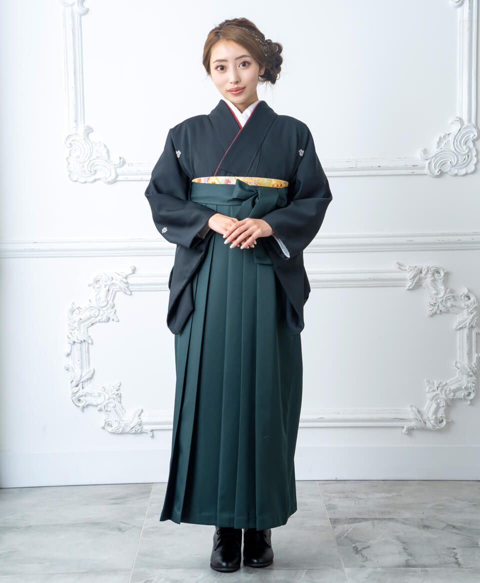 卒業式袴レンタルで宝塚風の袴スタイルをお探しなら必見。黒紋付に深緑の袴を合わせたタカラジェンヌの卒業式のようなスタイルです。