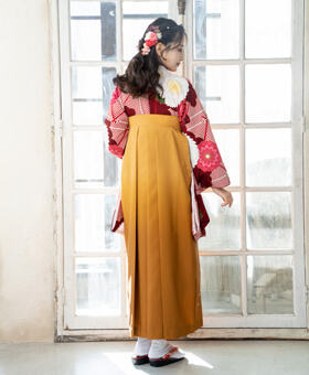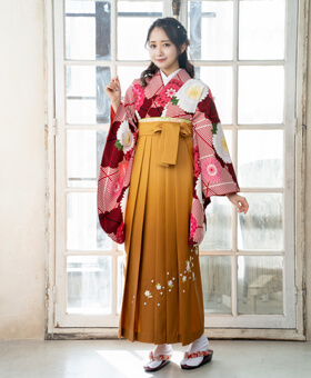 赤とキンチャの卒業式を代表する配色でまとめた袴コーデ。