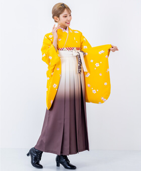 クリーム色から茶色にグラデーション染めされた袴が、黄色特有の奇抜さを押さえて着こなしやすくしています。
