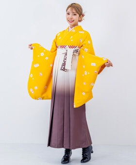 小花が描かれた黄色い着物に茶色のグラデーション袴を合わせた袴コーデ。