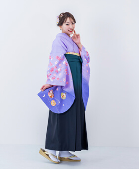 卒業式で落ち着いた雰囲気になる紫色と緑色の袴コーディネート。