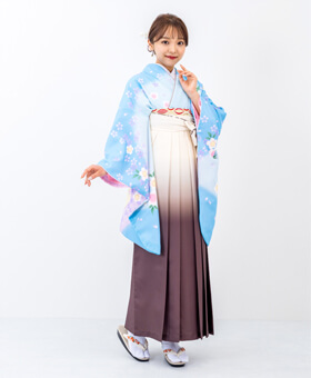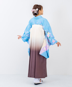 爽やかな水色の着物「水色八重桜」にクリーム色から茶色にグラデーション染めされた袴「チャイロクリームボカシ紐水玉」を合わせたコーディネート。