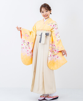 卒業式の袴レンタルで柔らかな雰囲気がでる黄色い着物とクリーム色の袴コーディネート。