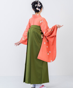 サーモンピンクのような柔らかなピンク色の着物に落ち着いた抹茶ひも縞の袴を合わせた袴コーディネート。