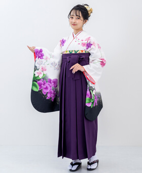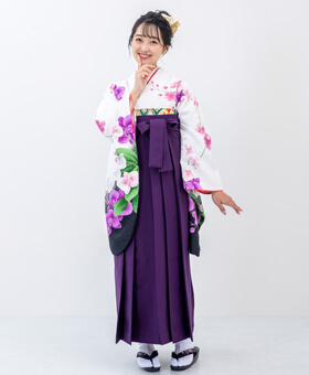 白地の着物に紫の袴を合わせたエレガントな袴コーデ。