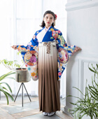 卒業式で人気のカフェラテカラーのレンタル袴に鮮やかなブルーの着物を合わせてみました。