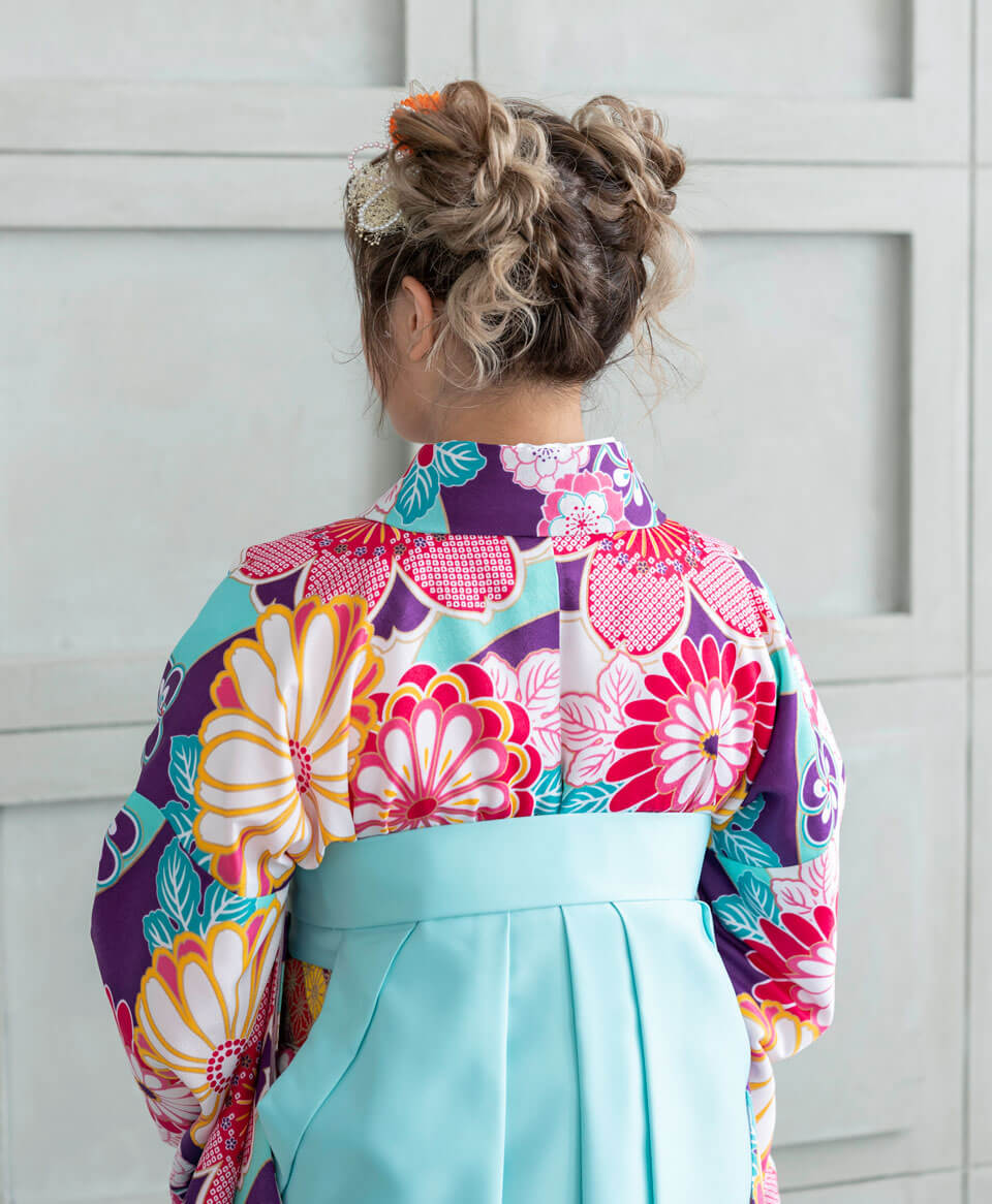 珍しいエメラルドブルーの袴は卒業式で絶対映える一着。