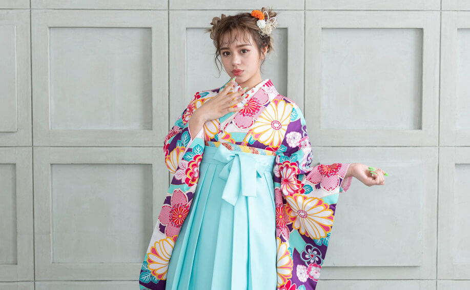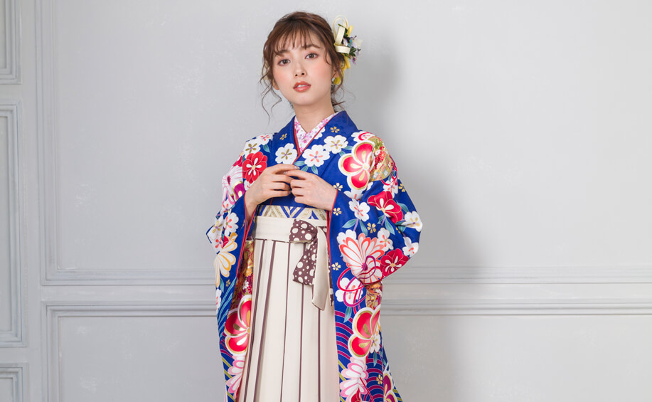 爽やかなブルーの色合いが鮮やかで、モダン柄の桜が人気。描かれている花の色と、袴の色を組み合わせると、統一感のある素敵な印象に。
