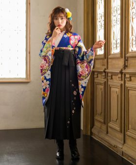 小学校の卒業式で大人っぽい雰囲気になれる、上品な青地の着物[BBB477]とシックな黒地の袴[KRY208]のコーディネート。