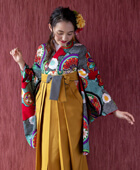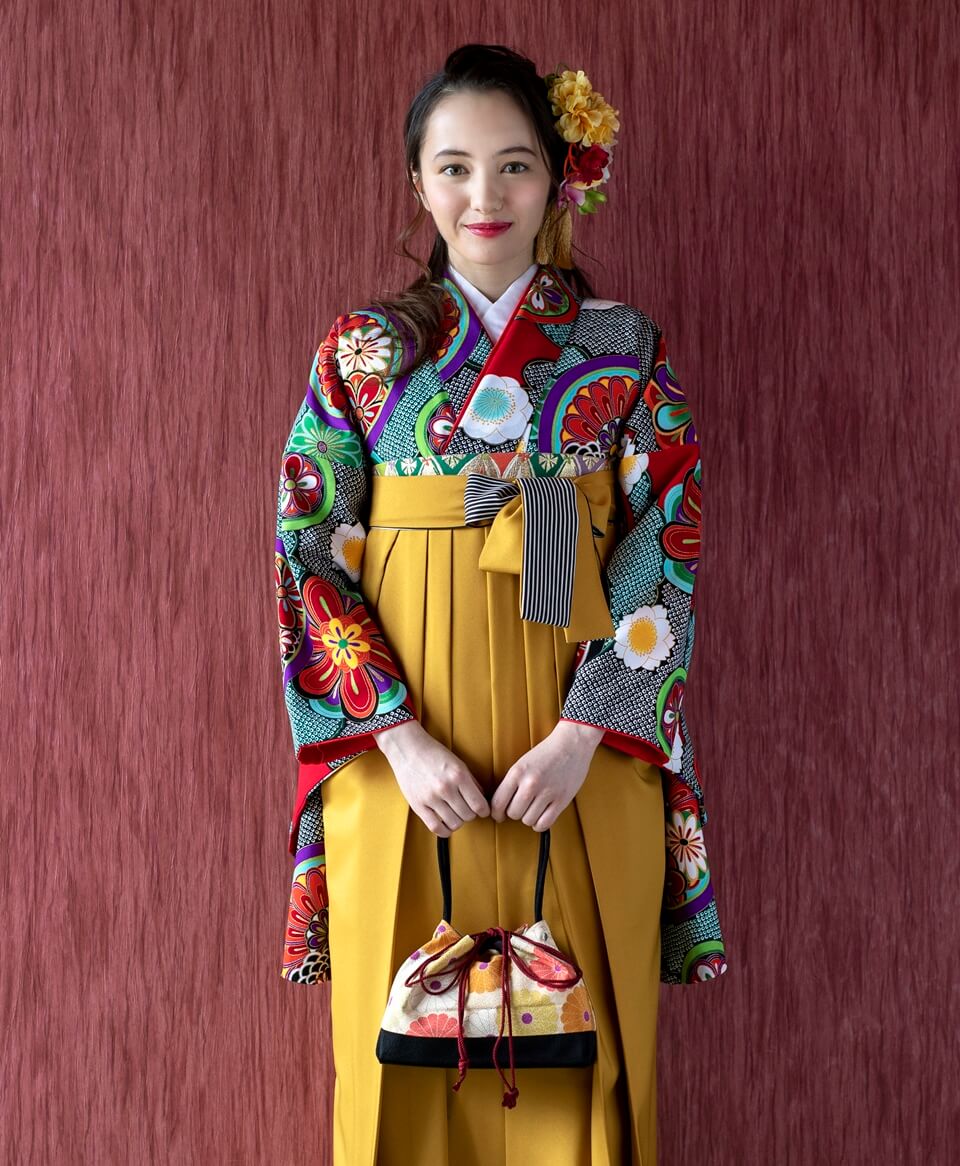 レトロ柄の花鏡が色鮮やかで卒業式にぴったり。