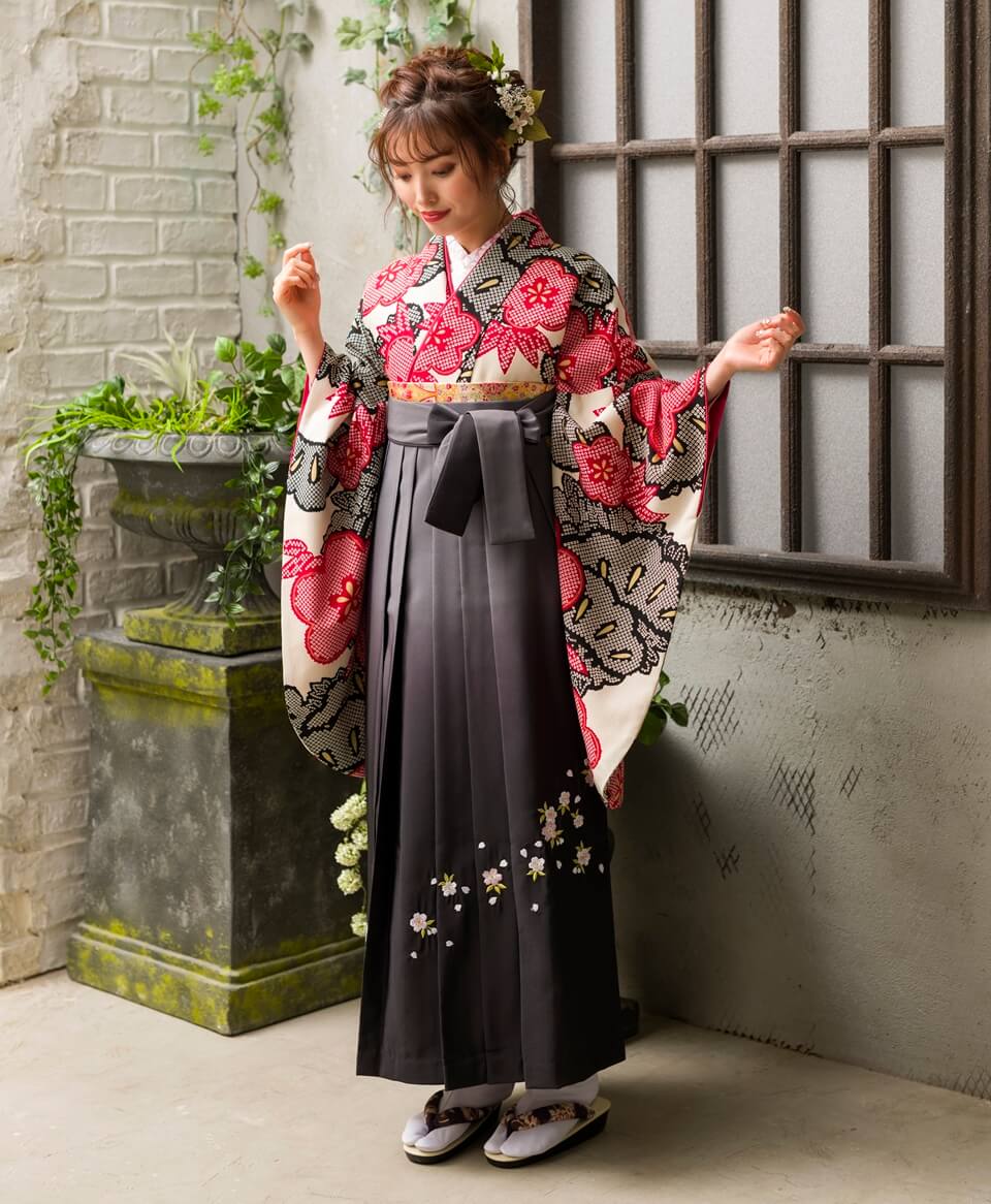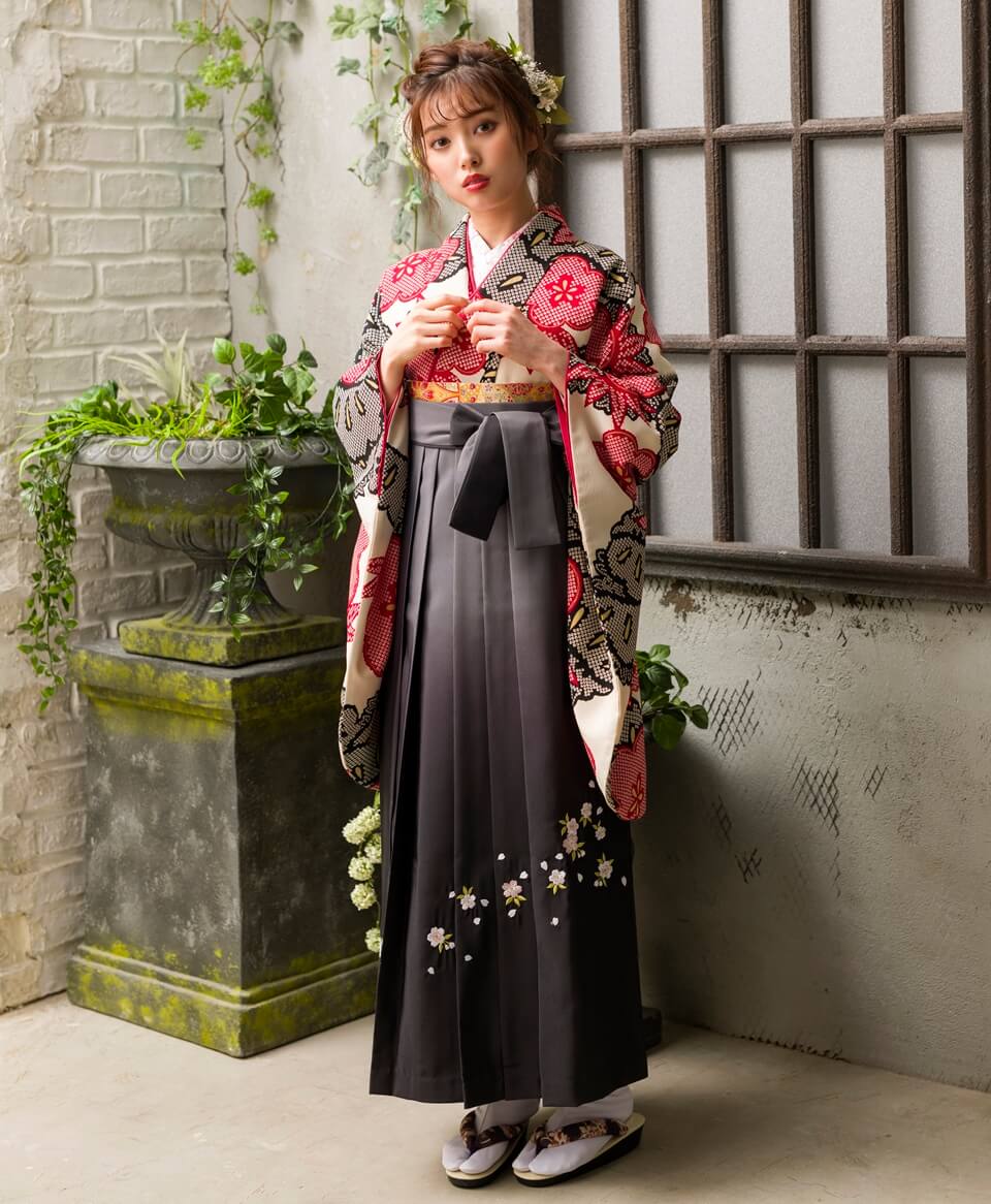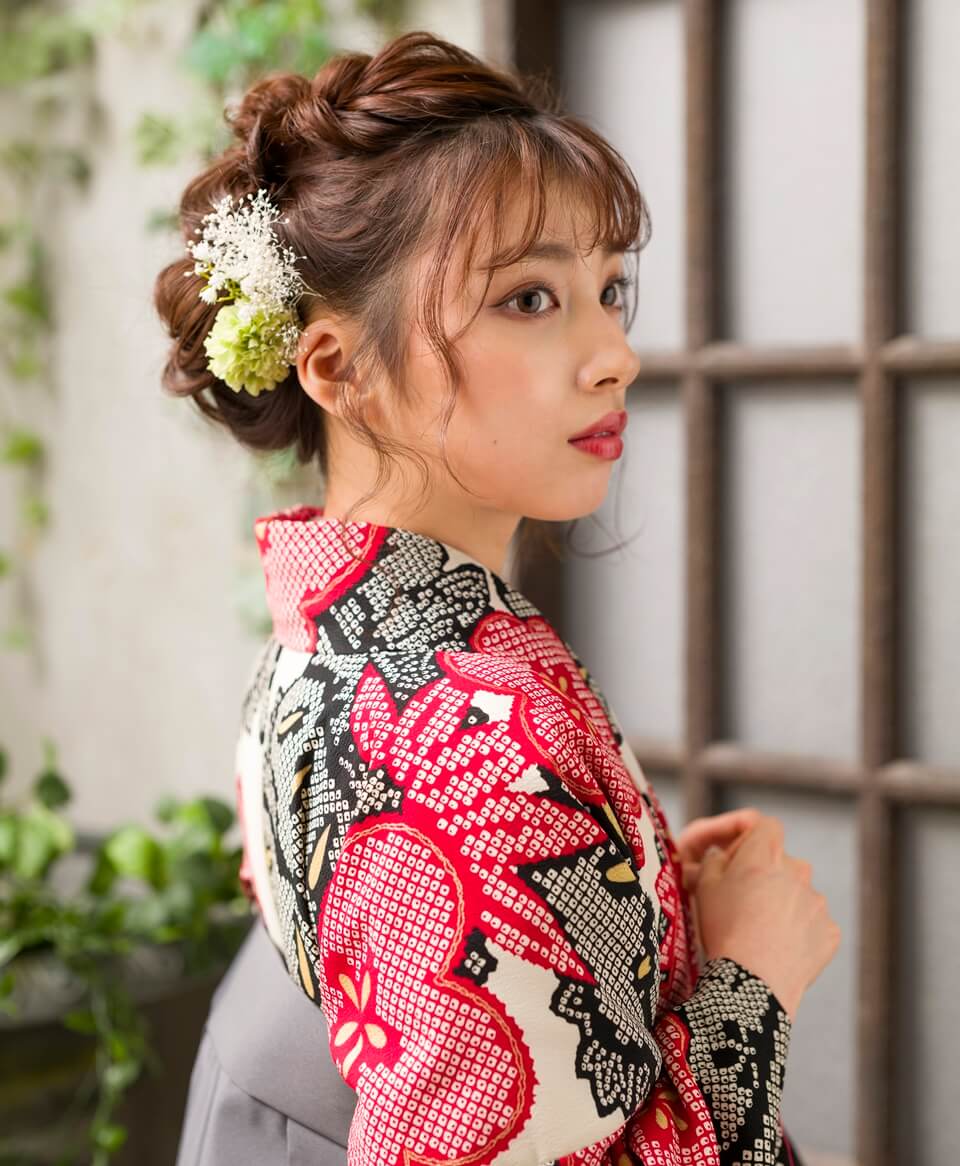 卒業式の袴レンタルするなら、甘すぎないのに可愛い赤と黒の絞り柄はいかがでしょうか。