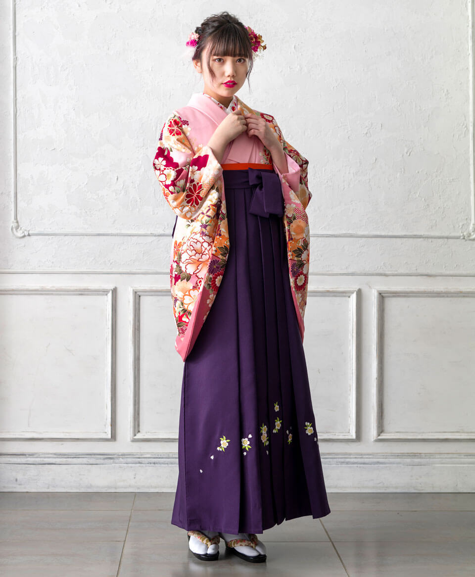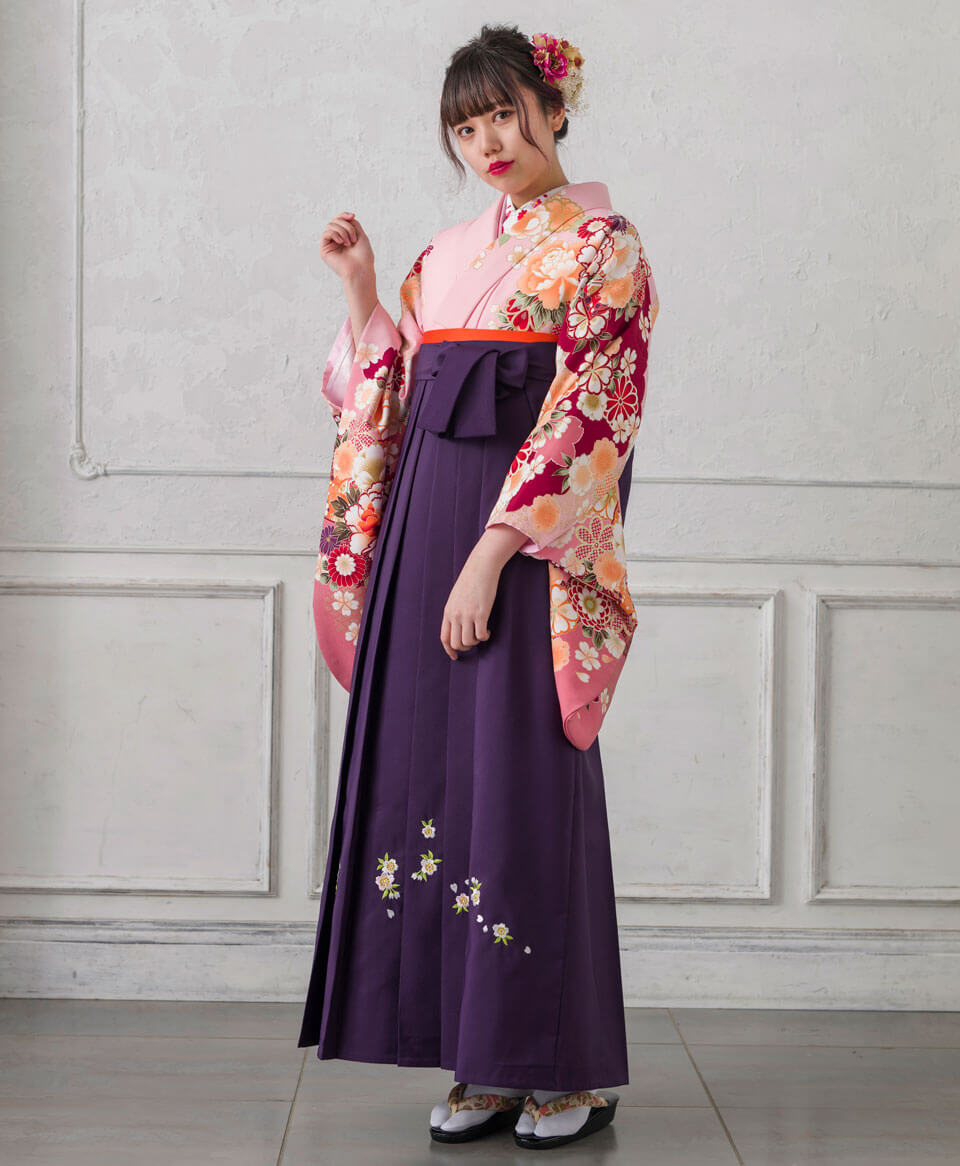 | 卒業式で袴をレンタルするなら、可愛いのに、どこか大人っぽい上品さもある卒業式袴はいかがでしょうか。 京都さがの館でレンタルできる着物:ピンクぼたん袖ボカシ[DDD848]と、袴:ムラサキシシュウ[MRS056]のコーディネートです。 卒業式にレンタルする袴は人生の門出を祝う特別なもの。 学生生活が終わり、新しい生活に向かって一歩踏み出すのなら、大人っぽい印象の卒業式袴はぴったり。 女の子らしい可愛さも捨てがたいとお悩みなら、こちらのコーディネートがおすすめです。 ピンクの着物は可愛い印象になりますが、落ち着いた上品な赤色と、伝統的な古典柄で大人な印象に。 女性らしい気品とミステリアスなイメージがある紫の袴を合わせるとより魅力的になりますよ。 卒業式の小学生用袴をレンタルするなら京都さがの館へ。 |