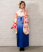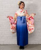 爽やかなブルーボカシの袴を組み合わせると、まるで咲き誇る草花の間を小川が流れているよう。