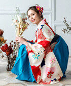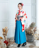 鮮やかなブルーの袴が知性を感じさせ、着物の袖に入った赤色を引き立てています。