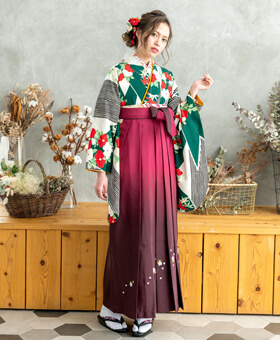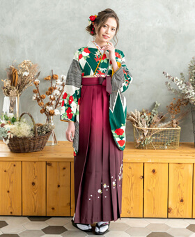 おしとやかな雰囲気を出せる緑色の着物『白緑短冊牡丹椿』に華やかな『ワインボカシシシュウ』の袴を合わせた卒業式の袴コーディネートです。