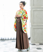 落ち着いた無地の袴「チャイロ」を組み合わせ緑と茶色で自然を感じる装いにしてみました。