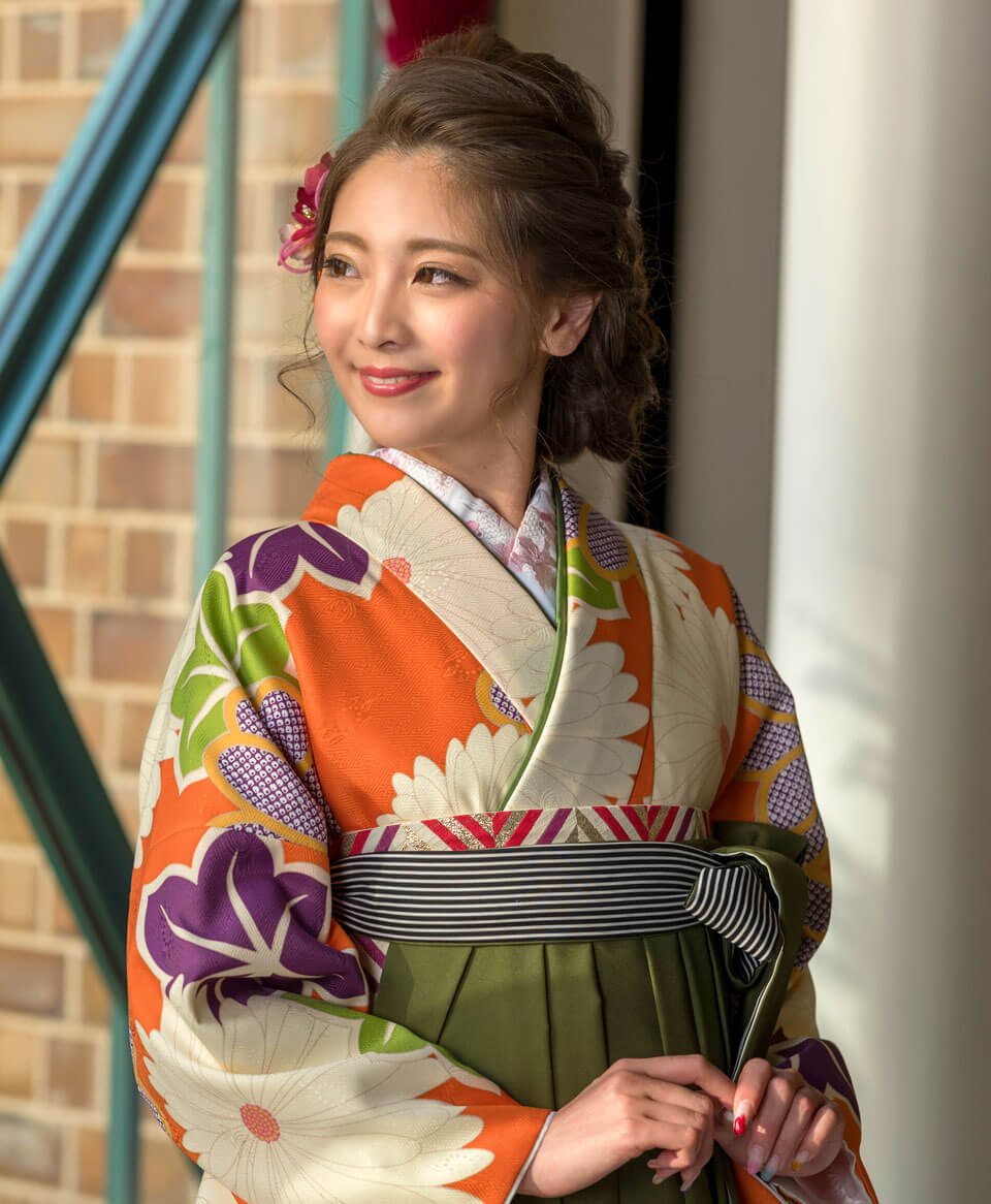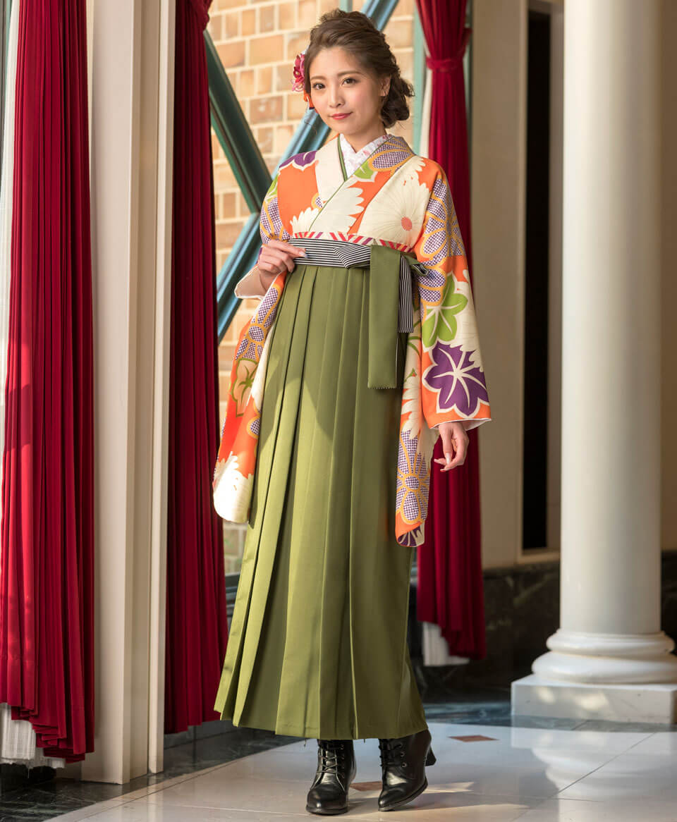 渋い色合いのまっちゃ色の袴はオレンジ色との相性も抜群。