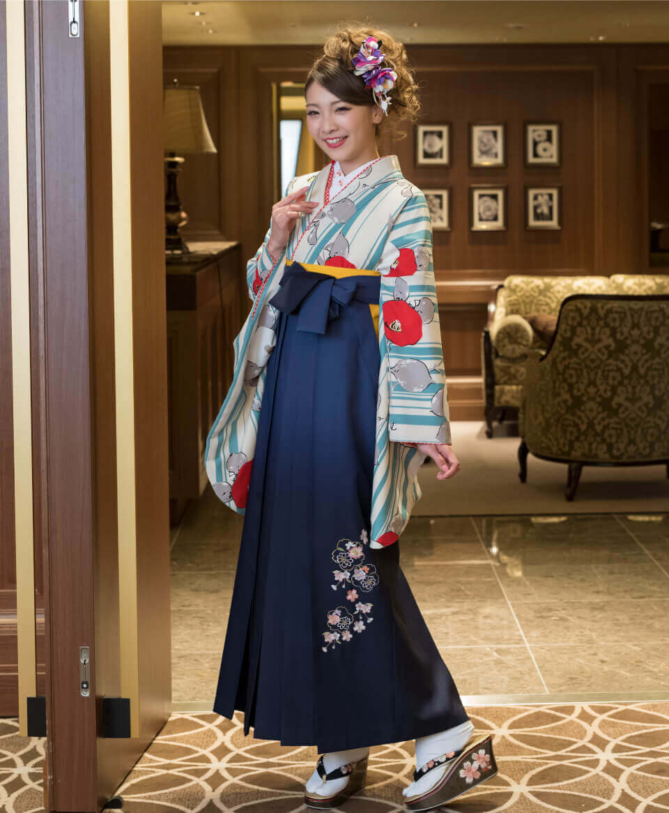 白地に水色の縞模様入りの着物[BBB431]。青色の袴[KBS067]の組み合わせ。